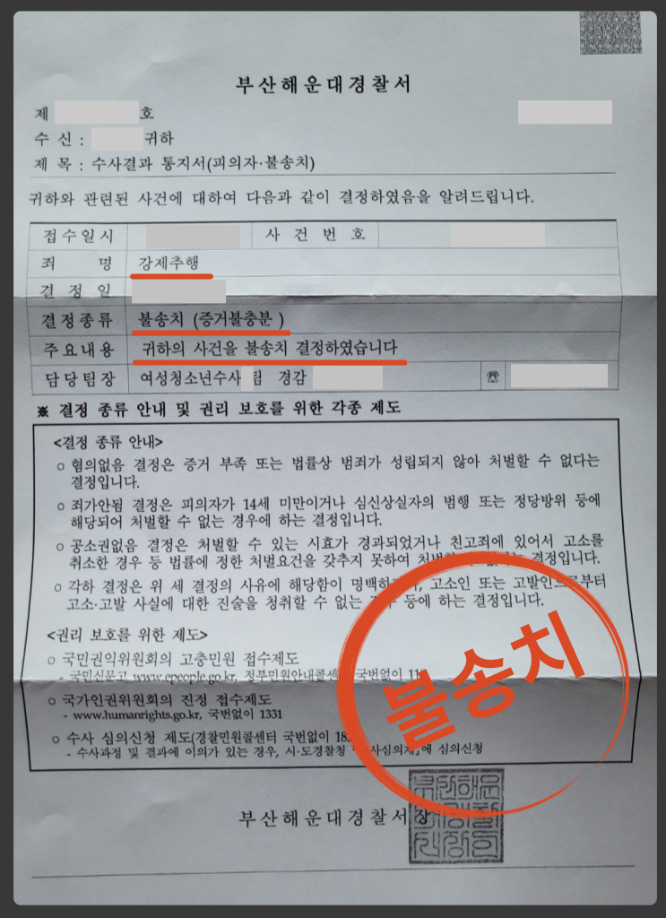 그 결과 경찰 단계에서 불송치(증거불충분) 결정을 이끌어내었습니다.