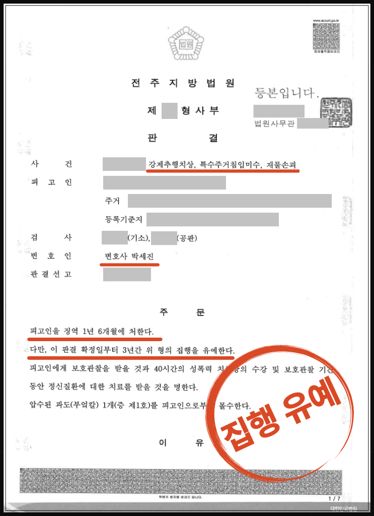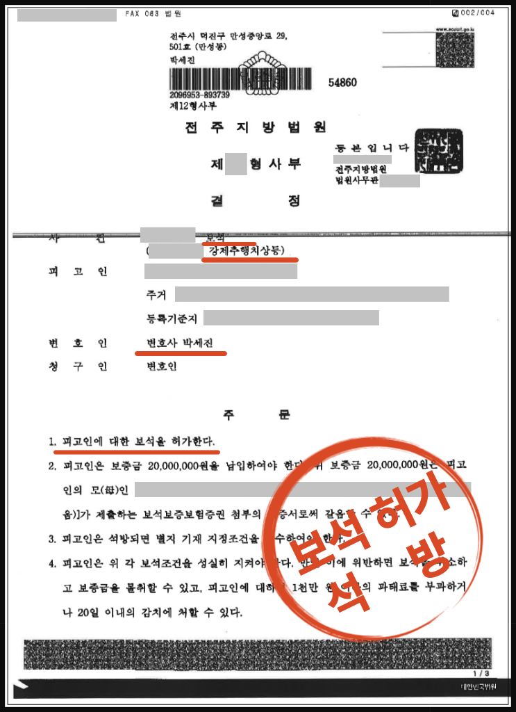 그 결과 법원으로부터 보석허가 결정을 이끌어내었고, 최종적으로 집행유예 선고를 받아 사건이 종결되었습니다.